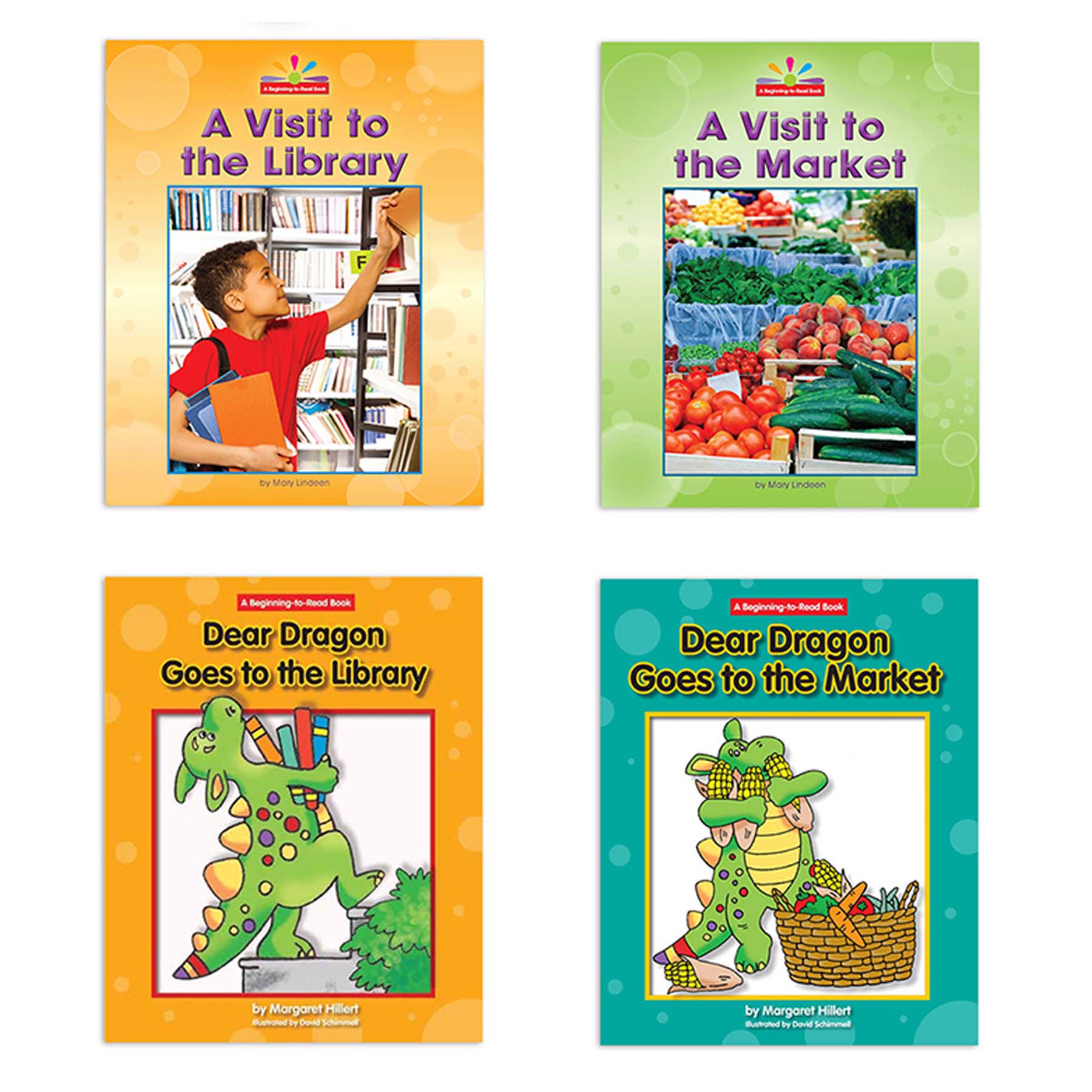 Books in the Community Places set include: A Visit to the Aquarium, Dear Dragon Goes to the Aquarium, A Visit to the Firehouse, Dear Dragon Goes to the Firehouse, A Visit to the Library, Dear Dragon Goes to the Library, A Visit to the Market, and Dear Dragon Goes to the Market.