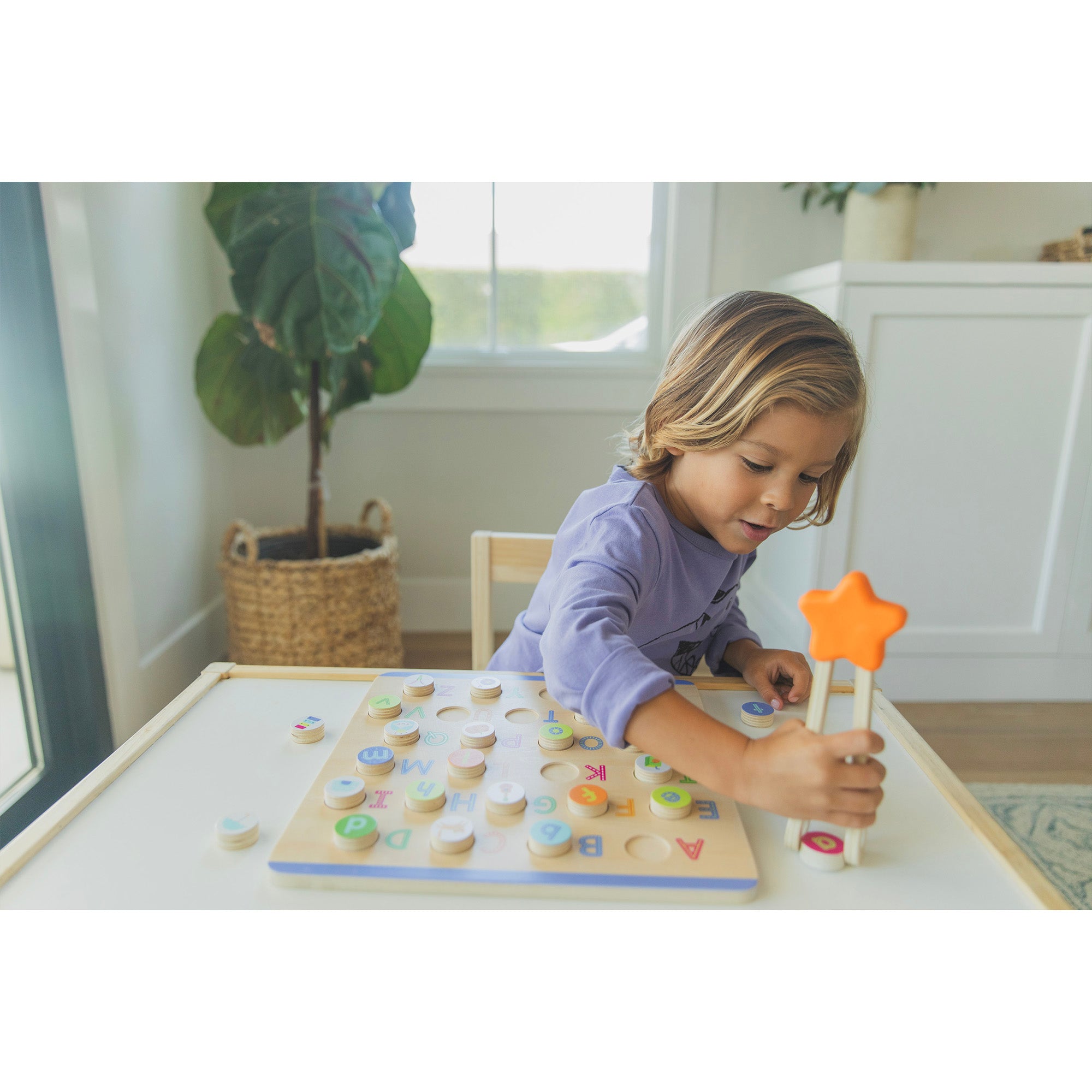 iii : Includes wooden board with uppercase alphabet, 26 double-sided wooden tokens with lowercase letters and illustrations to represent letter sounds, Easy Tweezies wooden squeezers, and activity guide.