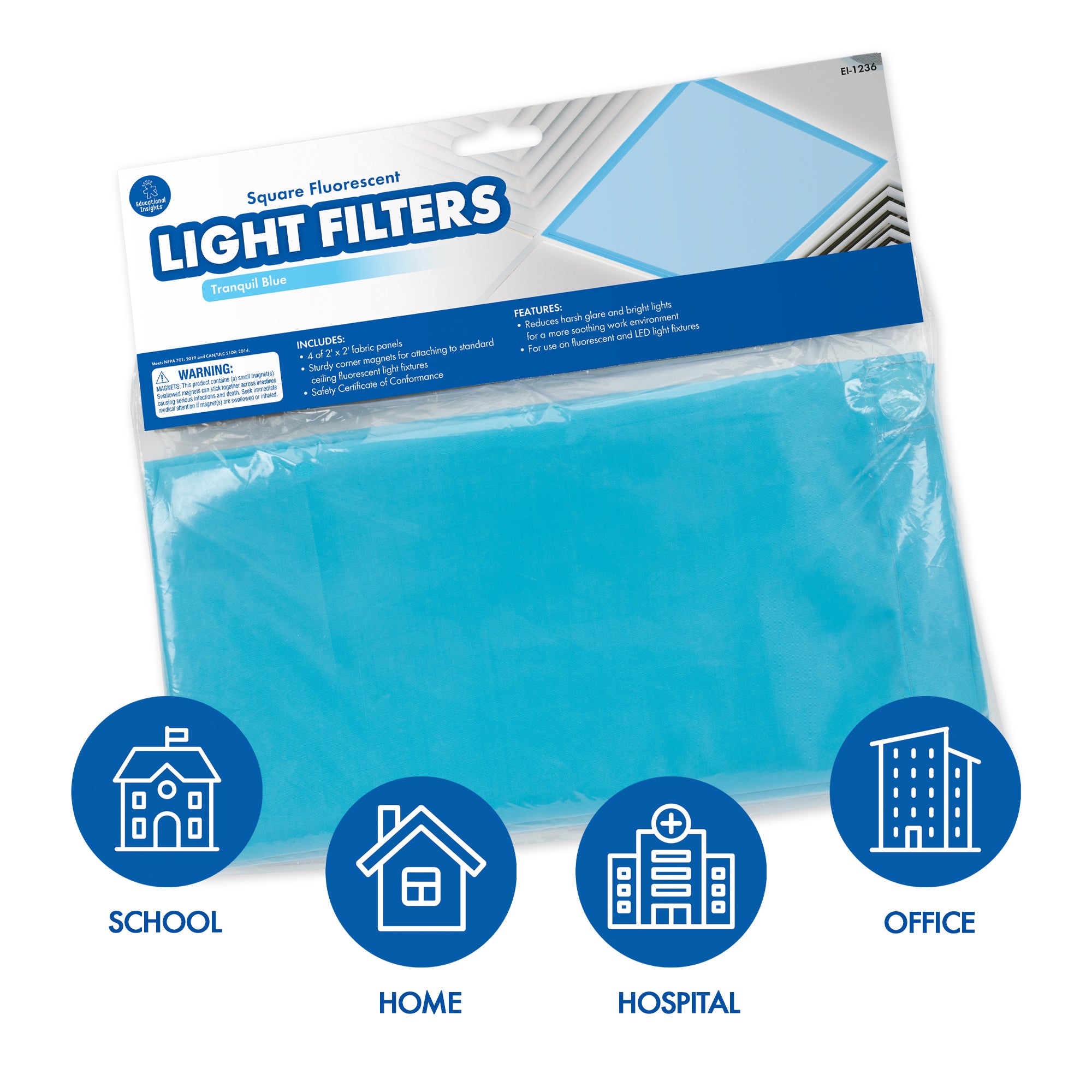 Fluorescent lights are a staple in classrooms and offices, but their harsh glare and flickering light can cause eyestrain, headaches, and anxiety. Cover your fluorescent and LED lights with these fabric panels that fit over standard ceiling fixtures with sturdy, sewn-in magnets. Each set includes four 2' x 2' heat-resistant panels in Tranquil Blue. For use with fluorescent and LED lights.
