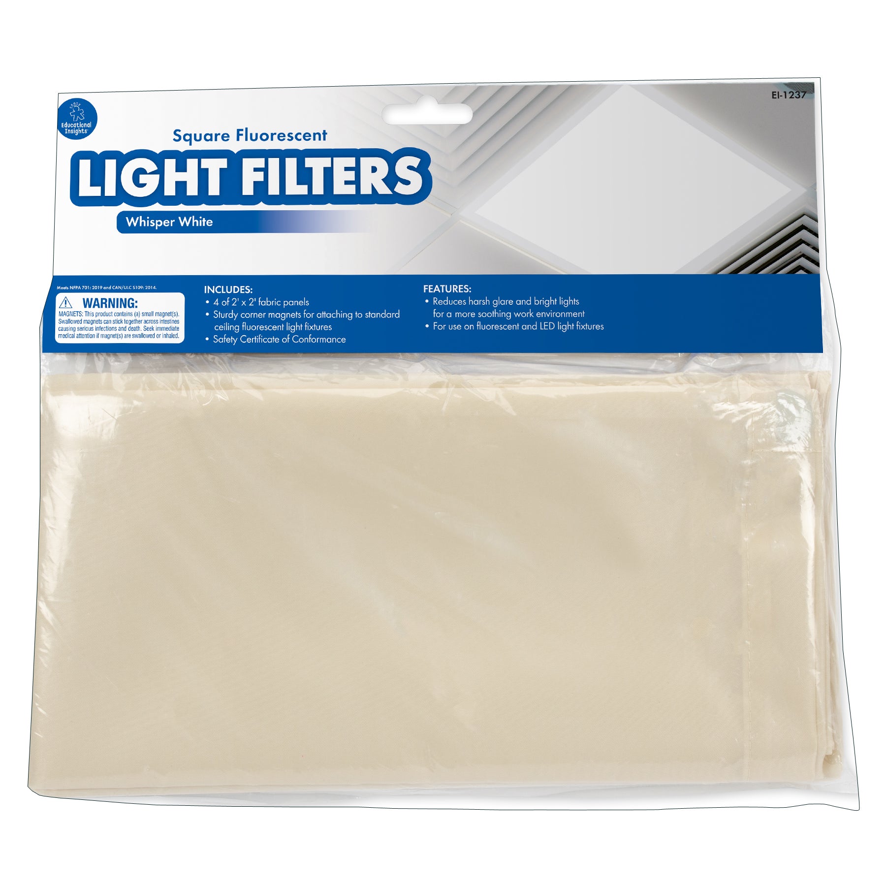 Create a calming and pleasant atmosphere with filters designed to reduce the flicker and glare of fluorescent and LED lights! Heat-resistant fabric filters measure 2' x 2'—a perfect fit for many offices and classrooms—and attach easily to standard ceiling figures with six sturdy, built-in magnets.
