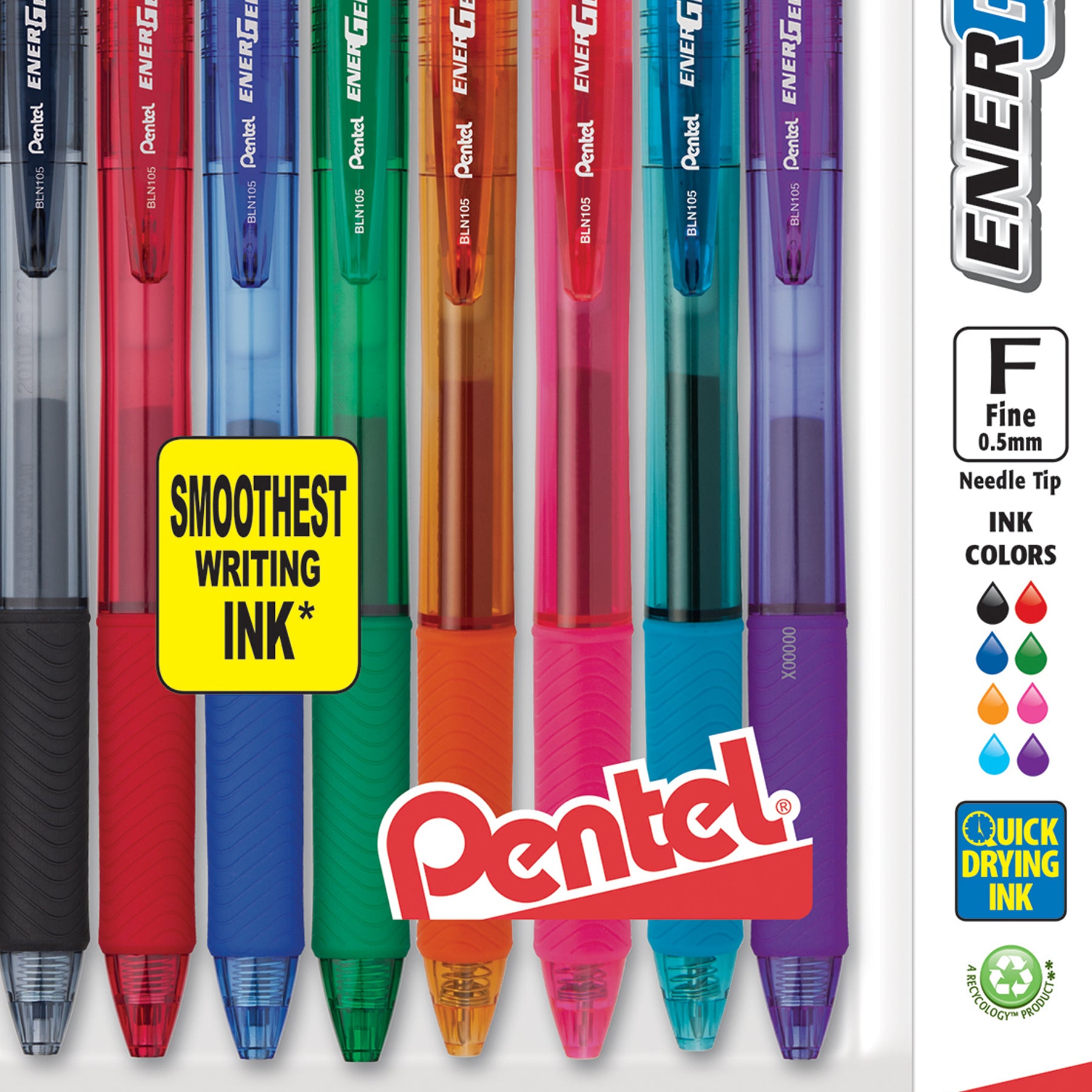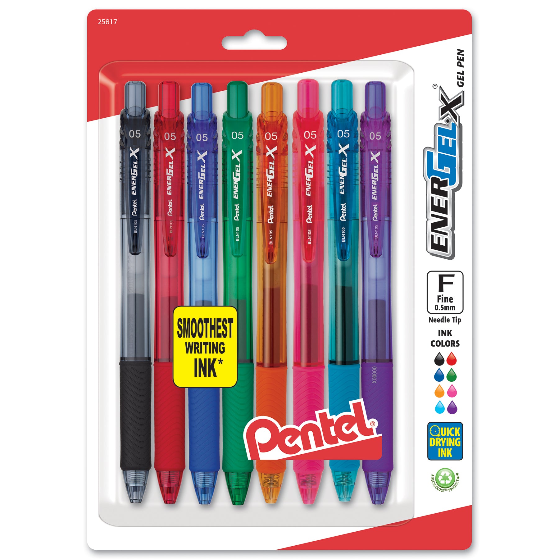 The Pentel EnerGel-X retractable gel pen provides a smooth, effortless writing experience at a great price. High performance ink technology combines the best qualities of liquid and gel ink, and dries so fast even left handers love it - No Smears, No Smudges, No Globs. Stylish barrel colors match the ink inside for quick and easy color selection. The latex-free grip provides extended comfort and control when writing. It is available with a 0.5mm needle tip that writes fine lines and is refillable with any size and/or color of EnerGel refill. Each pack includes 8 pens in assorted ink colors: Black, Red, Blue, Green, Orange, Pink, Sky Blue and Violet.
