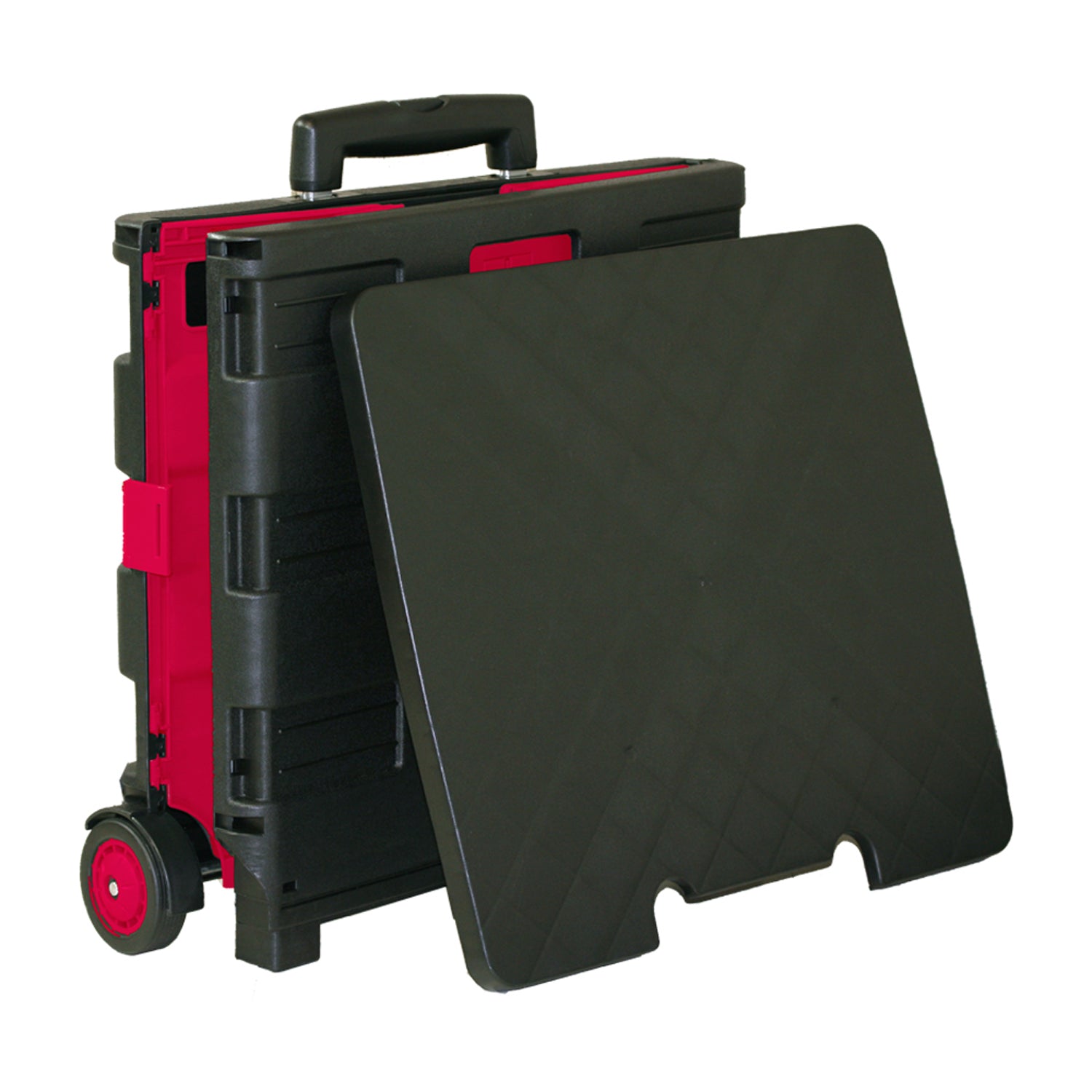 This 2-wheel plastic cart is foldable, so you can assemble it when you need to use it, and fold it down for storage. It has long handle that has few adjustable heights to match your height for comfort use. It is sturdy and can hold up to 70 lbs. Comes with a lid so you can protect your belongings from rain or wind; you can even pile more items on top of the lid to save a trip. Ideal for transporting books, documents, arts & crafts items and more! A great tool for teachers. Black and Red for a sporty feel and greater look.