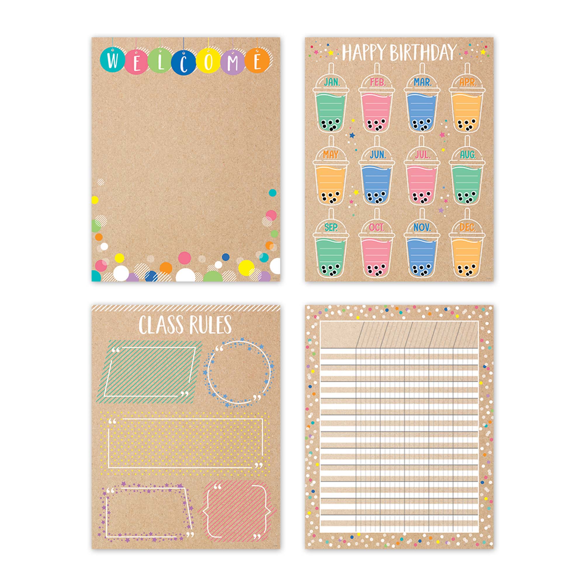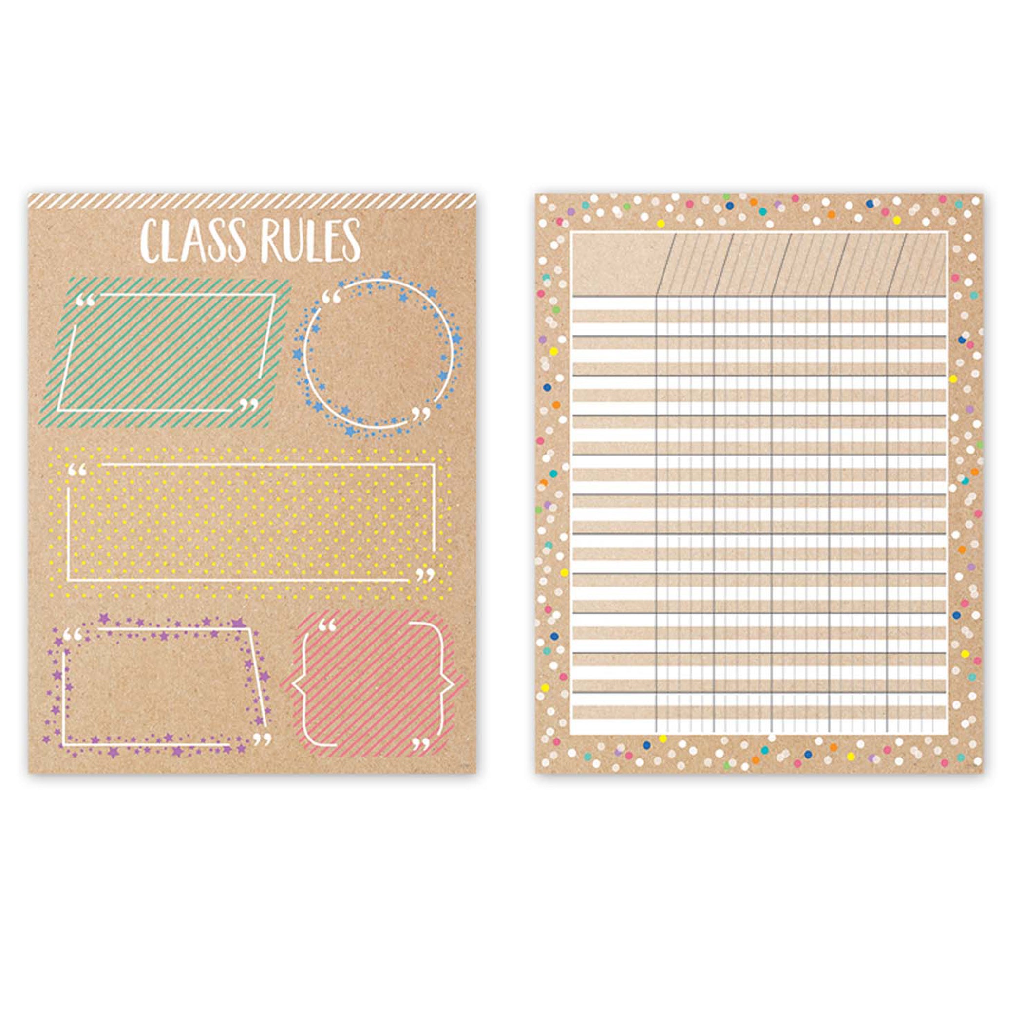 The Krafty Pop Classroom Essentials 4-Chart Pack will help organize and communicate important information in any classroom. Pack contains a welcome chart, birthday chart, class rules chart, and incentive chart. Essential charts for any classroom! All but Incentive Chart include activities and reproducibles on the back. Charts measure 17" x 22".