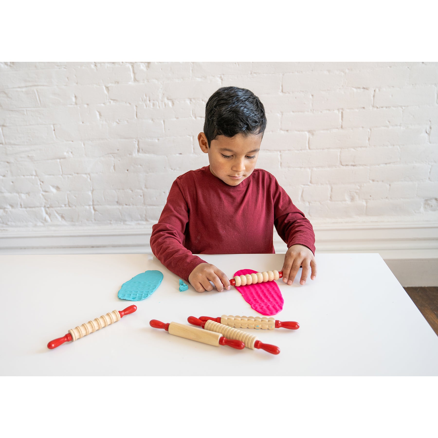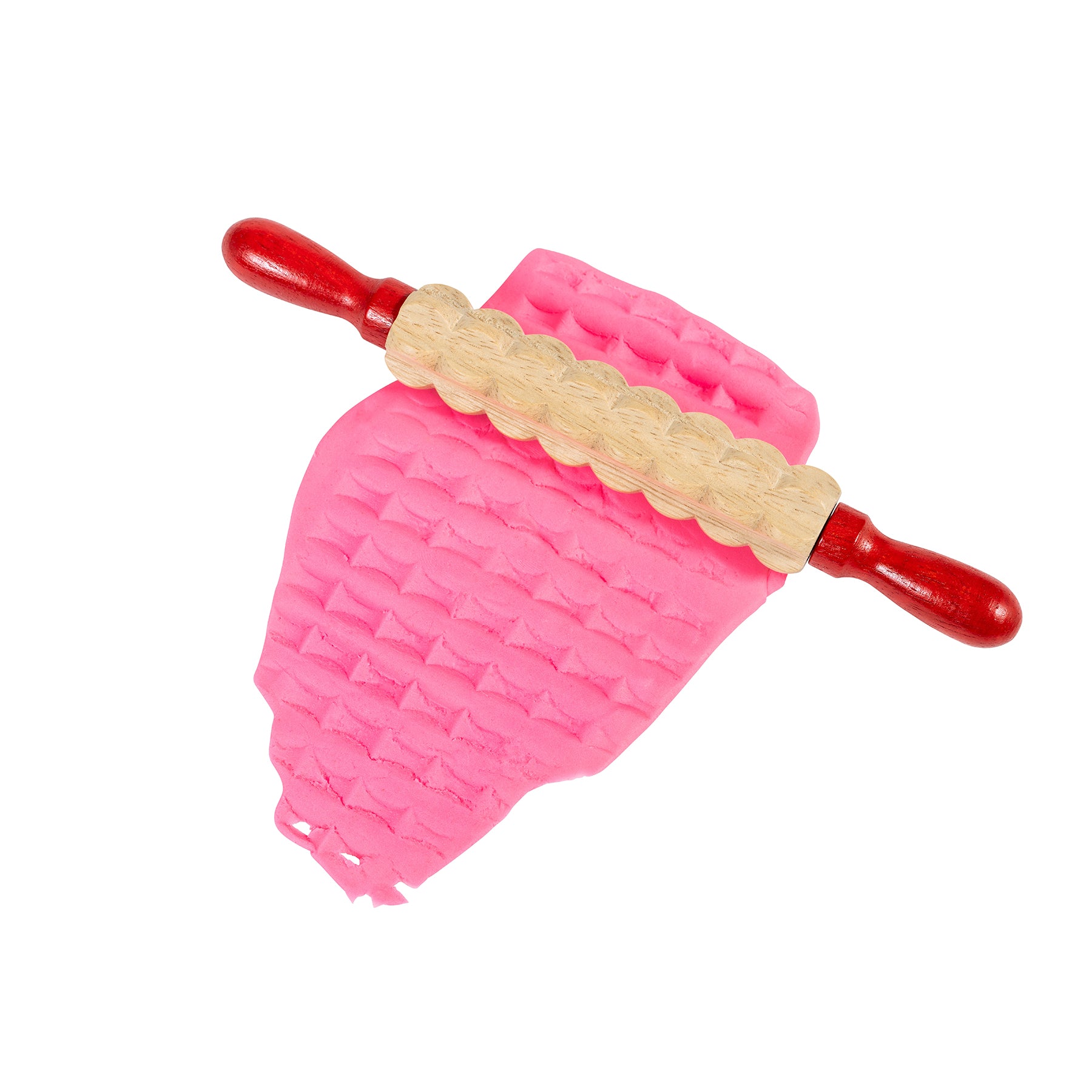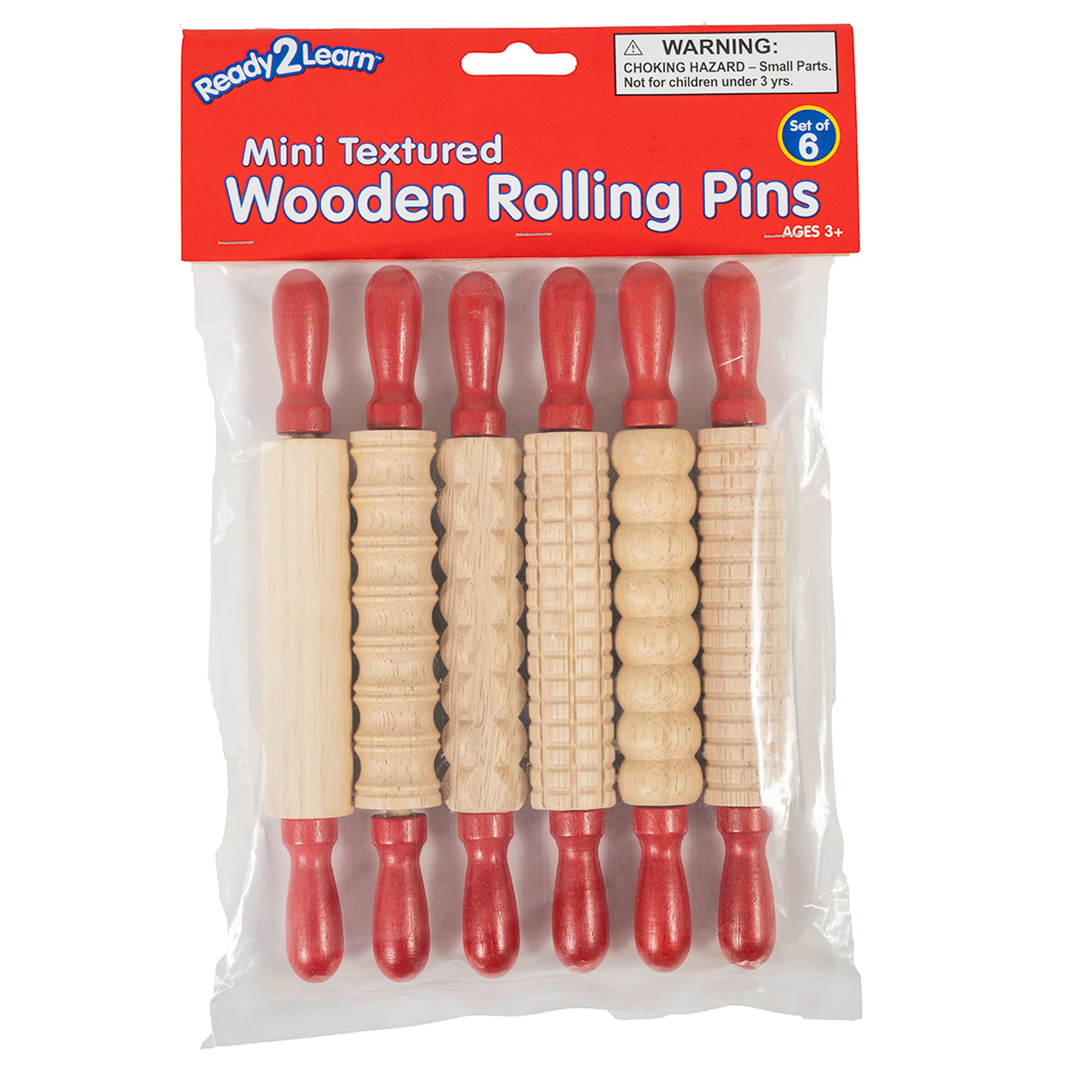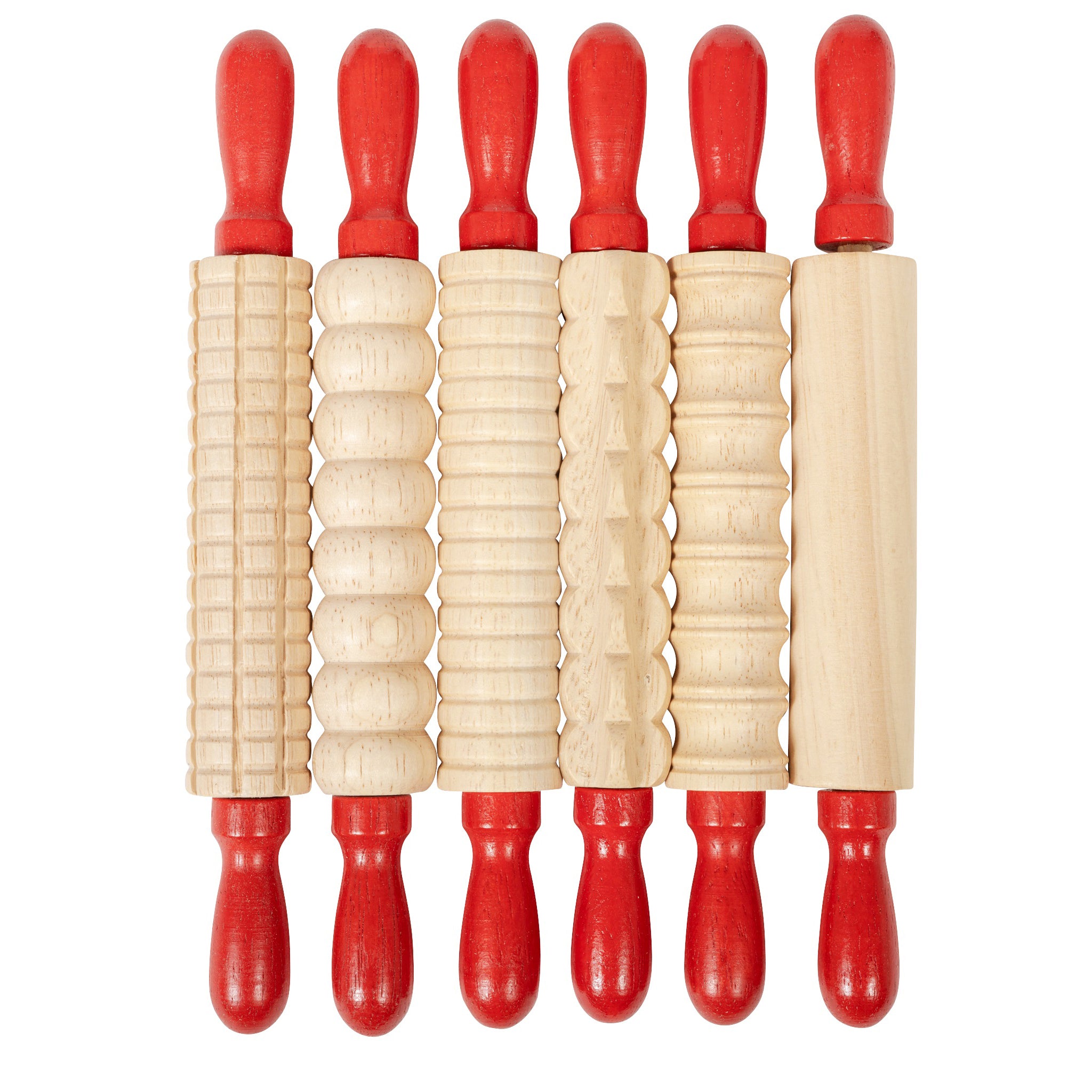 This set of 6 textured wooden rolling pins is perfect for child dough products. These rolling pins are made from durable wood with red handles that spin, making them easier for children to manipulate. They're designed to last for years of home or classroom use. Roll textures into clay, dough, baked goods and more. Children can even mix the designs to make new patterns. Foster imagination and creative expression with these open ended crafting tools. Rollers are a foundational tool in any arts and crafts environment. To clean them, just rinse with soap and warm water. For ages 3+. Size: 7.26"L x 0.9"W.