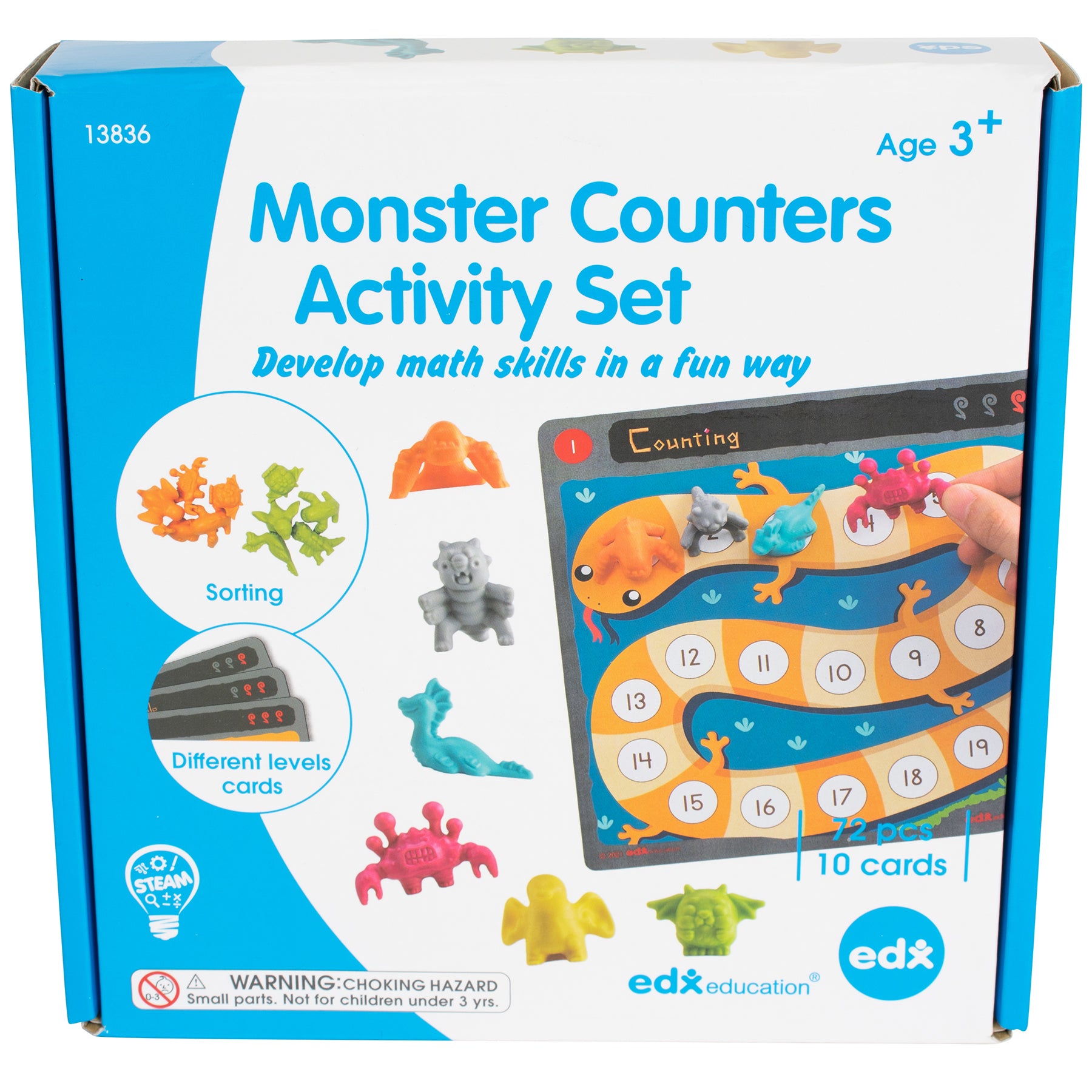 Use this activity set to develop early math skills. Use the activity cards and monster counters to learn number concepts like sorting, counting, patterning, parts of a whole, less than, greater than and more. This set of manipulatives comes with 72 plastic counters, 1 transparent spinner, and 10 double-sided activity cards. The counters come in 6 bright colors and 6 monstrous shapes!