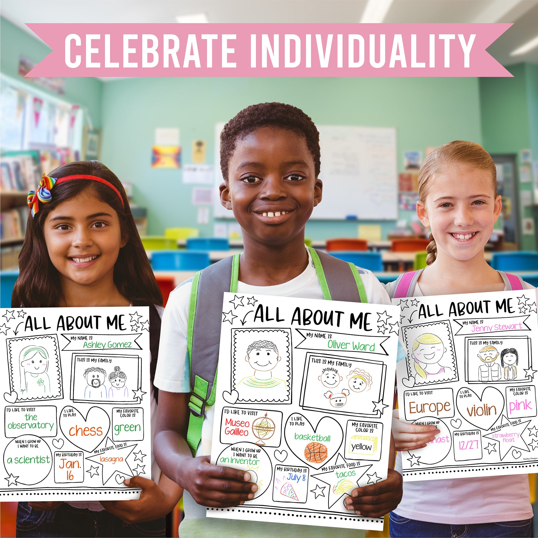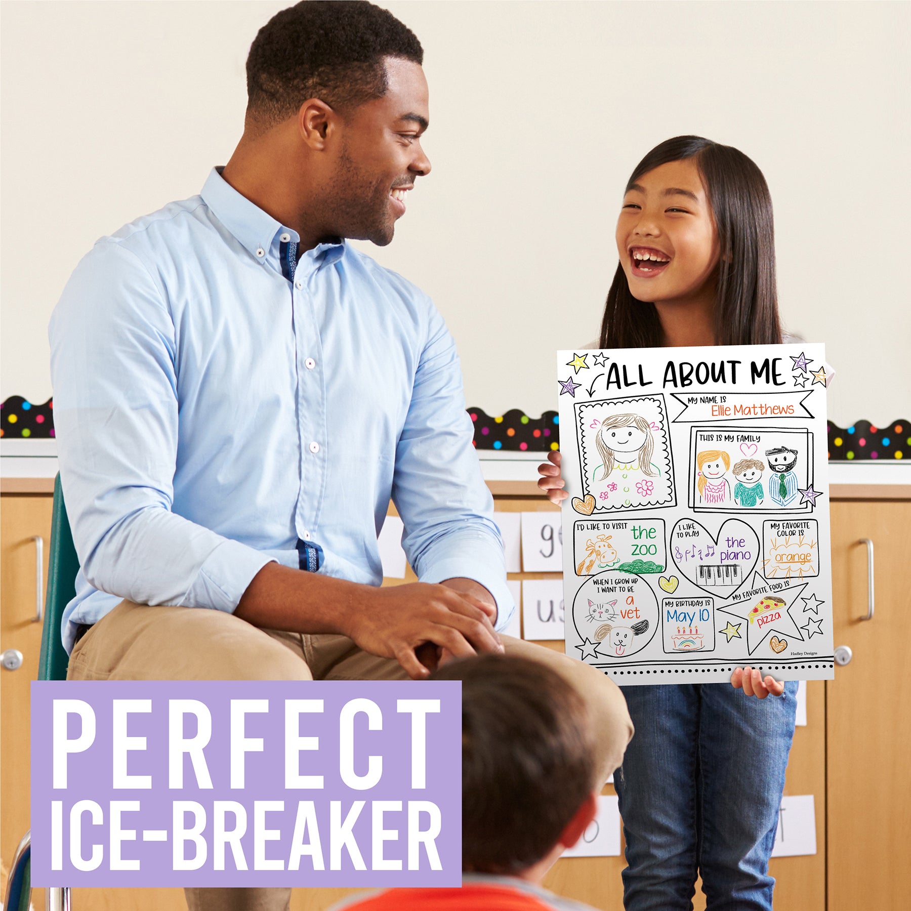 Looking to get to know your students better? Then you need this all about me poster set! Whether you're looking for preschool teacher supplies / preschool supplies for classroom, kindergarten teacher supplies, or elementary school teacher supplies, these posters are a fun way to help students of all ages and grade levels learn more about each other. Measures 11x14 inches, 20 posters included!