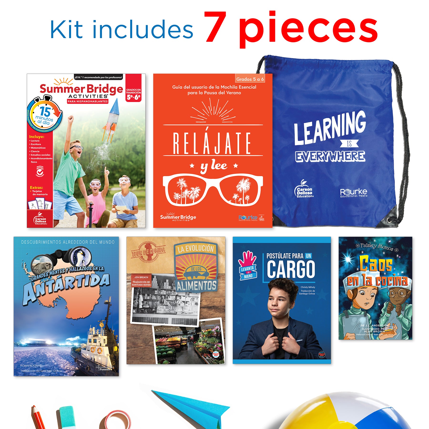 Build a bridge of learning opportunities for your soon-to-be 6th grader—from school to home and back again in just 15 minutes a day—with engaging children's books, manipulatives, and learning adventures—all in one bundle! Spanish workbooks and children's books are a great way for to reinforce fifth grade skills and prep your child for middle school through fun, active learning adventures. Students dive into the magic of reading while developing their reading comprehension skills with a variety of nonfiction and fiction children's books. The 160-page 5th grade workbook to 6th grade workbook features math, science, social studies, reading, and handwriting practice, and includes flash cards, fitness activities, and more! Spanish instructions and lessons in the Spanish workbook for kids help Spanish-speakers to work alongside their child, with English translations of vocabulary in parentheses where applicable for activities that help students learn English concepts. Activities pertaining to learning English are written in English with Spanish instruction. A Spanish user guide is also included for added engagement. Each Spanish language learning resource is stored securely in the durable drawstring bag so your child can practice skills on-the-go all summer long.