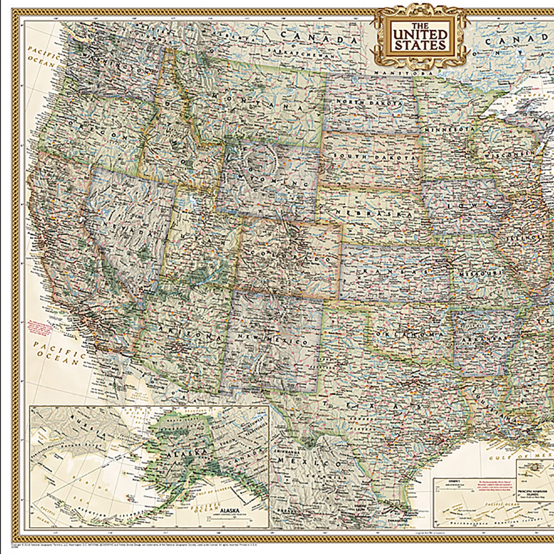 Expertly researched and designed, National Geographic's United States wall map is the standard by which other reference maps of the U.S. are measured. Antique-style "executive" color palette. All 50 states with insets for Hawaiian Islands and Alaska plus inset showing relative size of Alaska. Clearly defined state and country boundaries, cities, islands, national parks, and physical features. Thousands of place names carefully and artfully placed to maintain legibility in heavily populated areas. Background shows mountain ranges and valleys in subtle shaded relief with mountain ranges labeled. Major water bodies including rivers, lakes, gulfs, bays, straits, and ocean bathymetry. Transportation routes including interstate highways, major state routes, airports, waterways, canals, and ferries. The 36" x 24" poster size supports easy and affordable framing and mounting, and takes less wall space than standard wall maps. The map is encapsulated in heavy-duty 1.6 mil laminate which makes the paper much more durable and resistant to the swelling and shrinking caused by changes in humidity. Laminated maps can be framed without the need for glass, so the frames can be much lighter and less expensive.