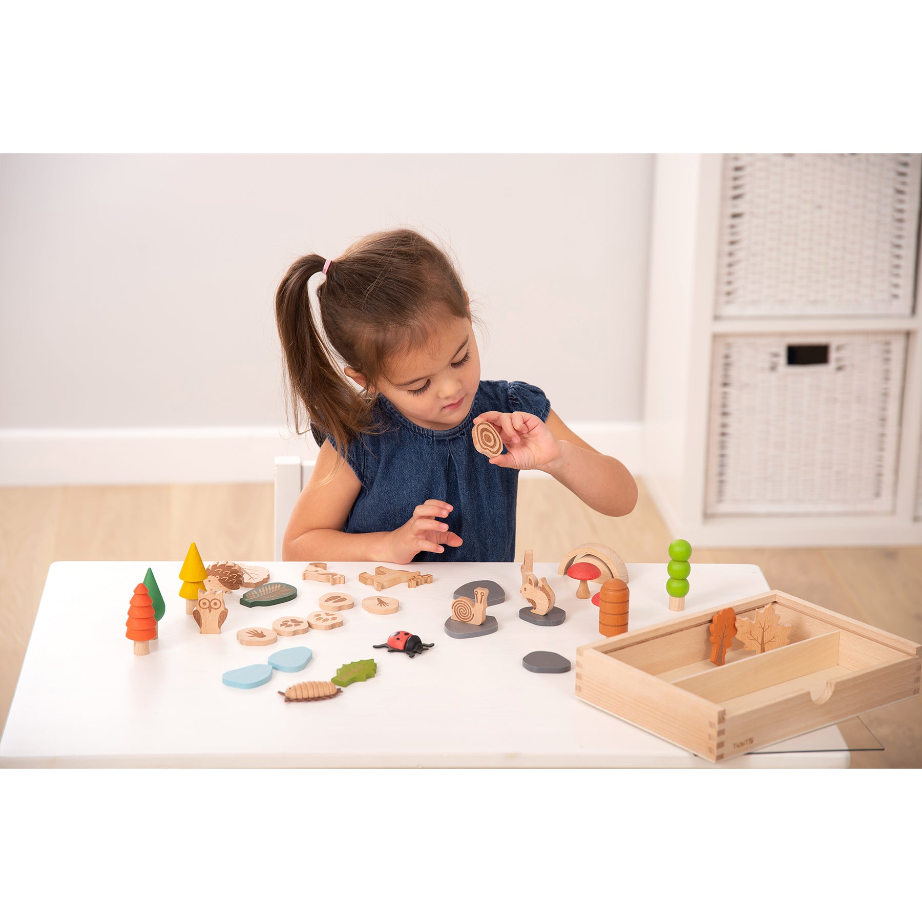 This set features an assortment of 37 woodland shapes. Create relaxing small worlds with little critters, stones, trees and more. These wooden toys are perfect for open-ended, creative play. Use descriptive language to explore storytelling and world-building. All the pieces feature a smooth, natural wood grain to promote comfort and relaxation. Some pieces are designed with added indents and textures. Made with durable beechwood, this set is designed to last for years of play. Use the wooden box and clear acrylic lid for easy cleanup and storage. Add this set to calming corners, playrooms and sensory bins. Includes: 5 trees, 5 leaves, 2 minibeasts, 2 toadstools, 6 stones and water shapes, 6 log slices with animal footprints on the reverse side, a 2-piece bridge arch, and a wooden box with a clear acrylic lid. For ages 3+. Size of tray: 10.6"H x 7.3"L. Size range: 1.5"H x 1.5"L - 2.4"H x 2.1"L.