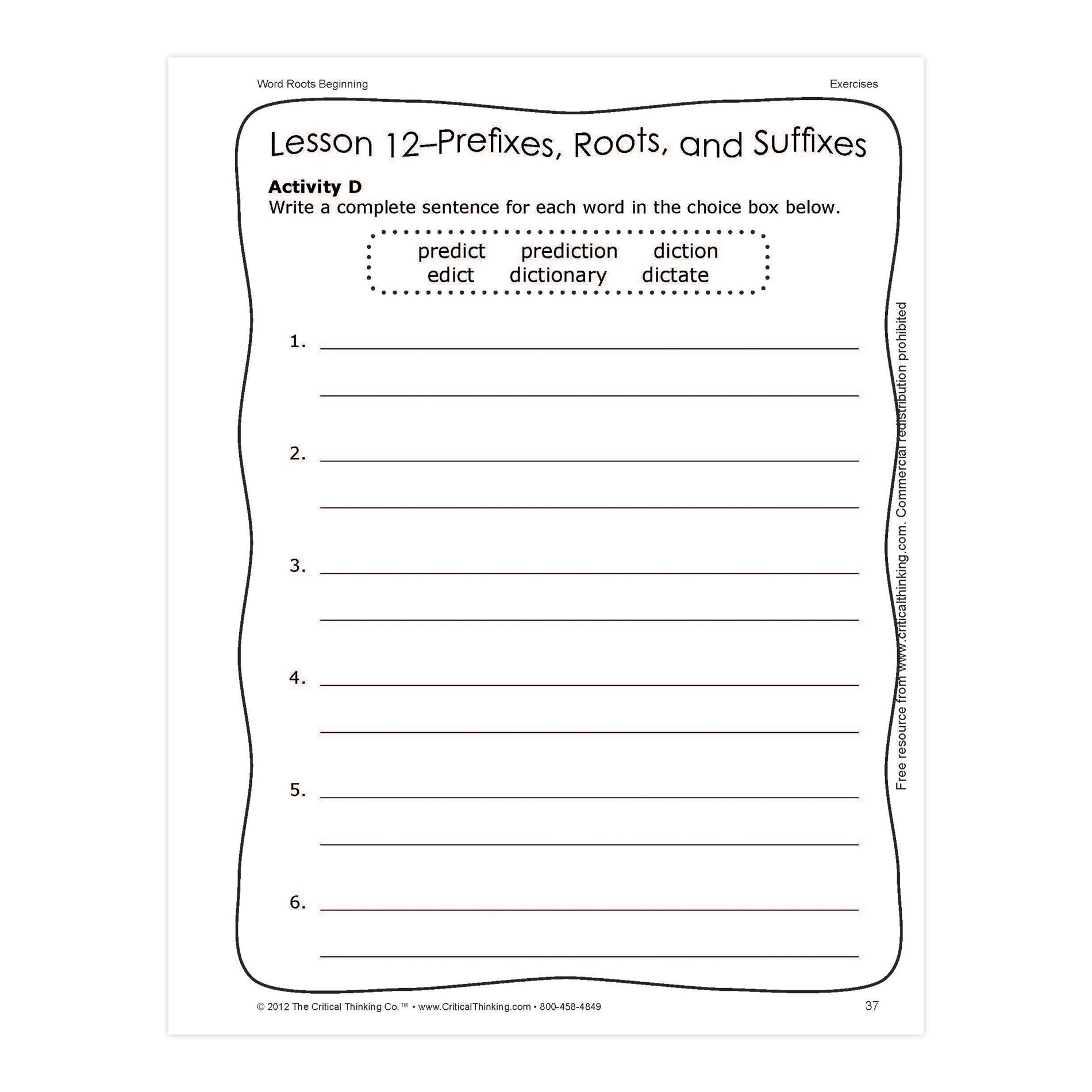 Each lesson has the meanings of prefixes, roots, and suffixes used to form the vocabulary words. The activities following the lessons include: